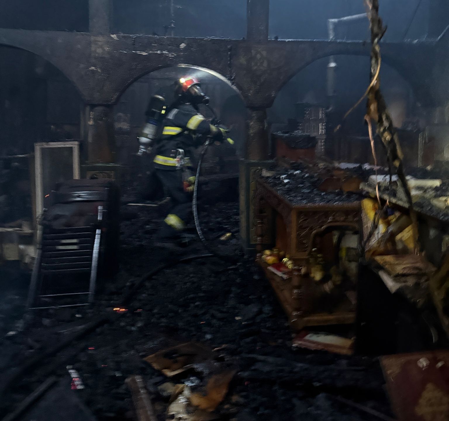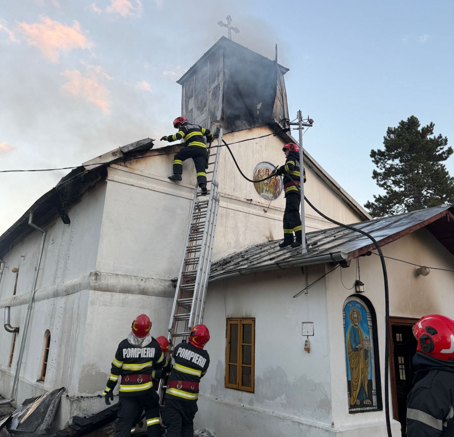 Pentru o intervenție optimă și pentru reducerea la minim a daunelor provocate lăcașului de cult, intervenim cu 5 autospeciale de stingere cu apă și spumă, 1 autoplatforma de intervenție și salvare de la înălțime, 1 ambulanță SMURD și o autospecială de primă intervenție și comandă.