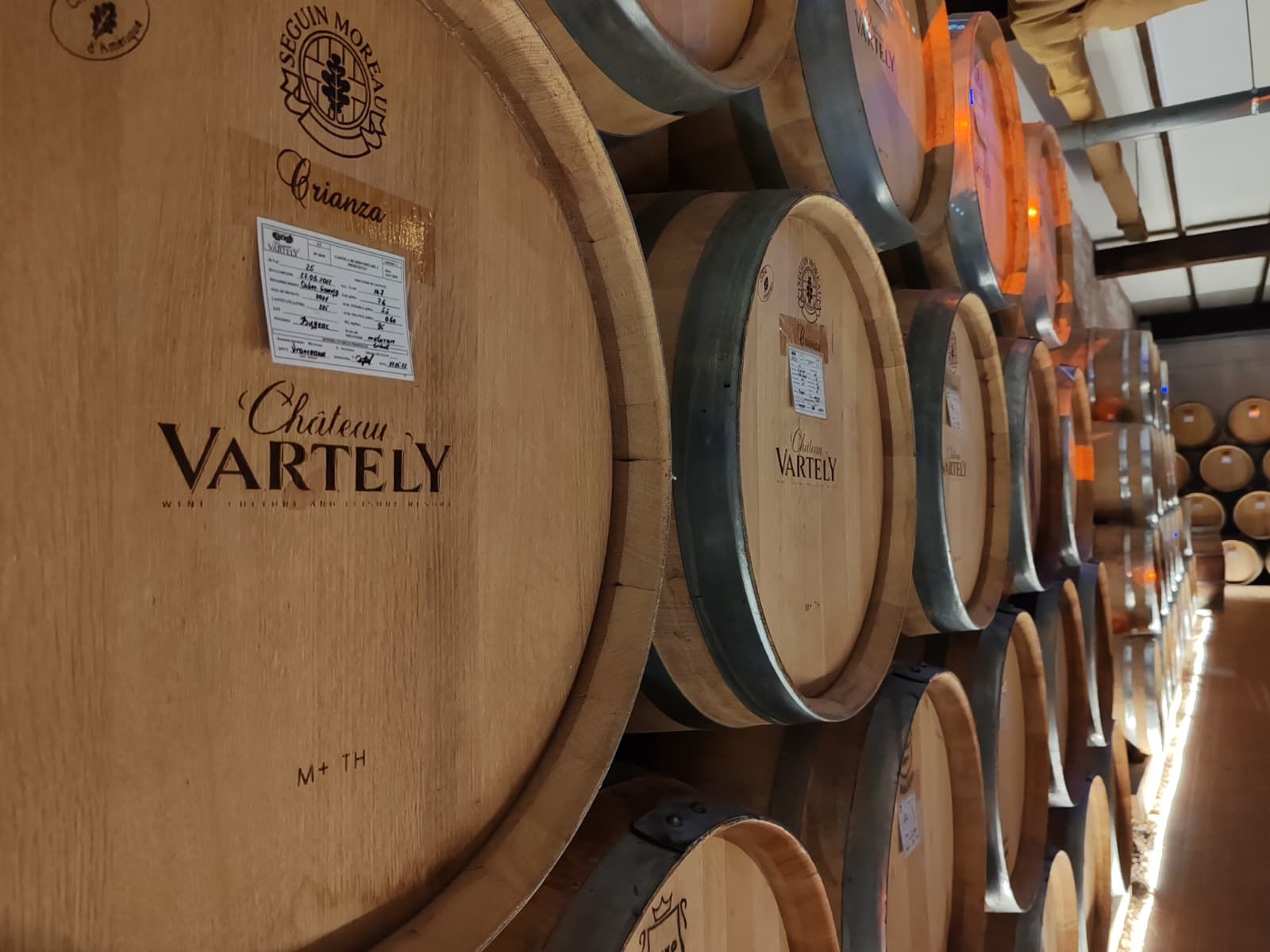 Ghidul nostru ne-a invitat să mirosim aromele înainte de a degusta vinul. În cramă, printre butoaie mari şi mici pline cu vin lăsat la învechit am aflat legenda locului prin intermediul unei proiecţii deosebite. La Vartely puteţi rămâne peste noapte în cele trei vile turistice, după ce v-aţi delectat cu vinurile premiate internaţional şi preparatele culinare asortate.